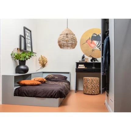Optimisez l’espace avec le lit d’angle Connect WOOOD : en pin massif gris béton, il offre placard coulissant, table de chevet et couchage 90x200 cm.