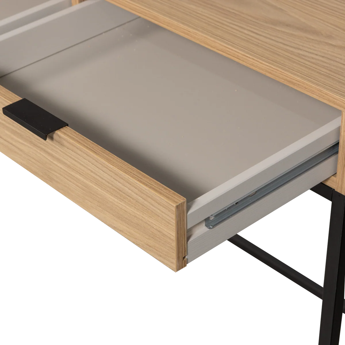 Le bureau moderne avec tiroirs WOOOD Silas est conçu pour allier robustesse et fonctionnalité. Le grand tiroir de 86 cm de large et le petit tiroir de 42 cm permettent de ranger facilement vos accessoires, documents ou fournitures. Chaque tiroir peut supporter jusqu’à 15 kg, tandis que le plateau résiste à une charge de 35 kg.