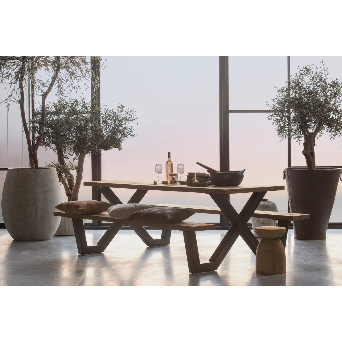 Préparez votre jardin pour de longues soirées d’été avec la table de pique-nique Tablo signée WOOOD. Son design élégant associe un pied en métal noir en forme de X et un plateau en bois thermo ayous FSC, durable et chaleureux.